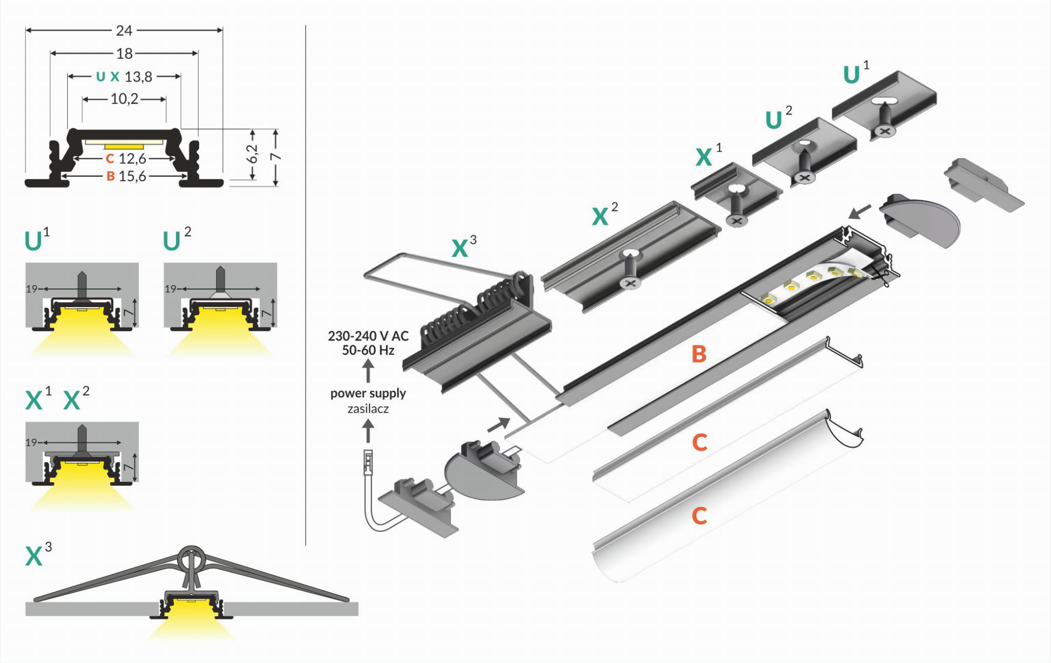 Montaggio: il profilo può essere montato nella parete, sul soffitto, sulle piastrelle o i mobili usando la colla da montaggio, il nastro biadesivo, la clip da montaggio GR oppure semplicemente infilandolo nella fessura. Per il profilo STANDARD STRG1 si può utilizzare la striscia di largezza 10mm (striscia LED con i diodi SMD 5050) oppure 8 mm (striscia LED con i diodi SMD 3528).