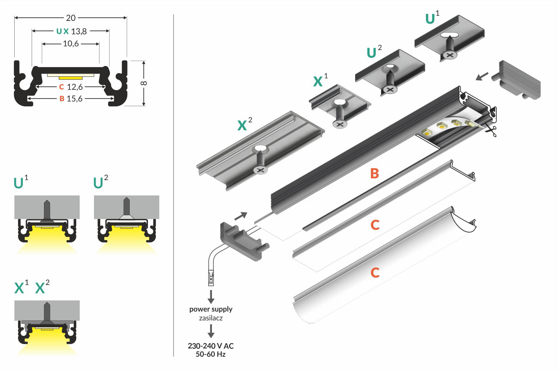 Montaggio: il profilo può essere montato nella parete, sul soffitto, sulle piastrelle o i mobili usando la colla da montaggio,la clip da montaggio SU, il nastro biadesivo oppure semplicemente infilandolo nella fessura. Per il profilo STANDARD STUS1 si può utilizzare la striscia di largezza 10mm (striscia LED con i diodi SMD 5050) oppure 8 mm (striscia LED con i diodi SMD 3528).
