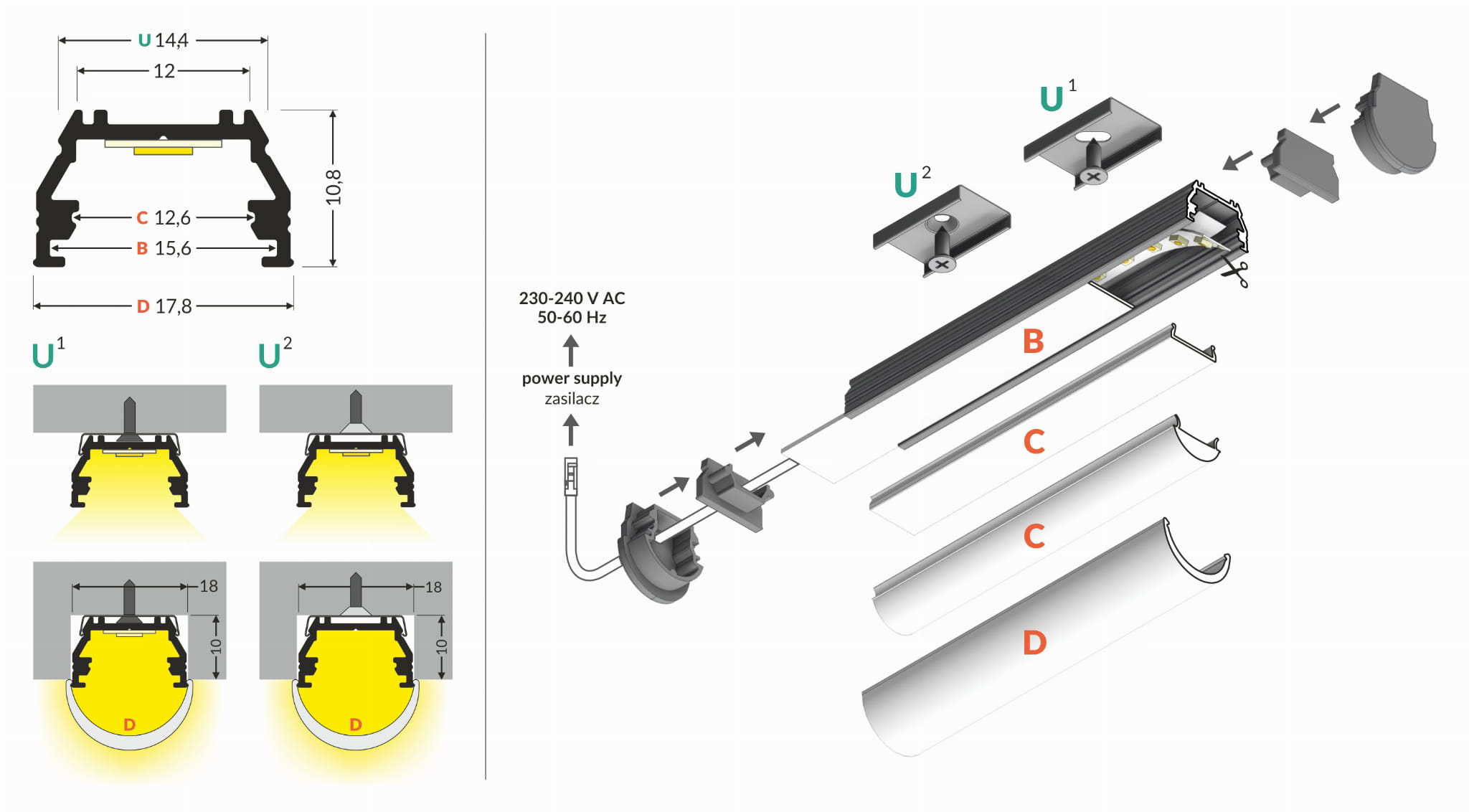 Profilo STANDARD STUS1 è realizzato in alluminio anodizzato, ed è ad incasso per le fessure di largezza di 18mm. Sporge oltre la superficie di montaggio di solo 1mm. Al profilo STANDARD STUS1 è possiblie scegliere uno di due coperchi (satinato o milky).