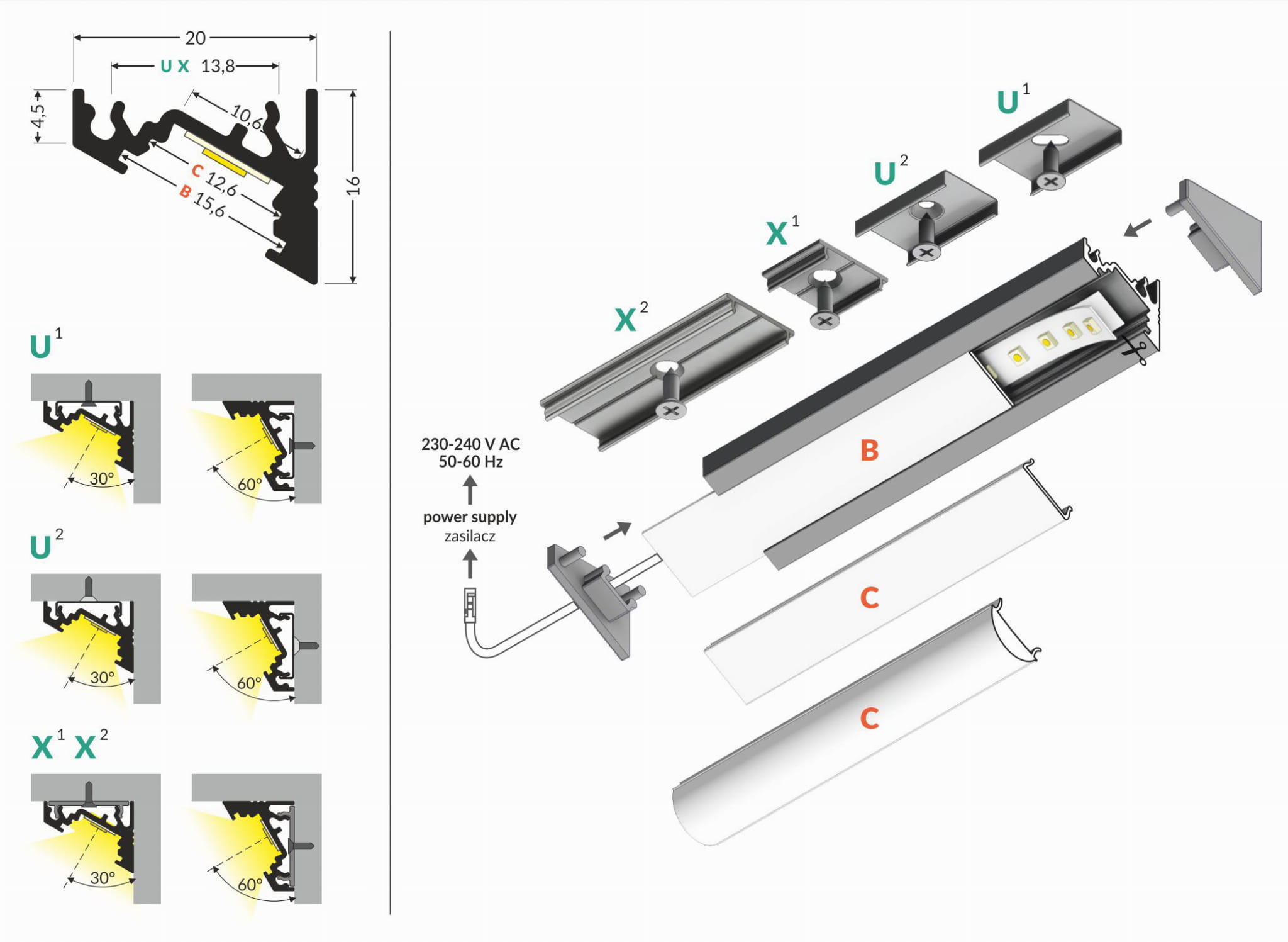 Profil kątowy polskiej marki TOPMET, dzięki niestandardowej budowie, można w zależności od ustawienia uzyskać kąt świecenia 30° lub 60° oraz zastosować w miejscach niedostępnych dla innych profili LED, jednocześnie nie tracąc na efekcie wizualnym. Doskonale nadaje się jako oświetlenie meblowe, ale będzie także przydatny zarówno jako podświetlenie gablot, wnęk czy półek