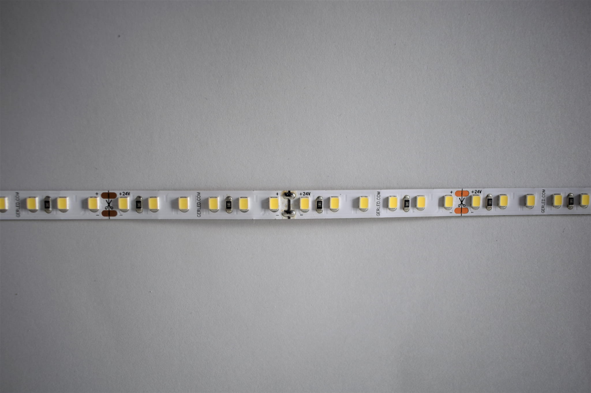Taśmy GERLED® Professional 2835 zasilane napięciem 24V pozornie niewiele różnią się od taśm zasilanych na 12V jednak kilka kwestii sprawia, że są one ciekawą alternatywą dla znacznie popularniejszych taśm 12V. Przede wszystkim zasilanie napięciem 24V znacznie ogranicza spadki napięcia na całej długości taśmy LED i pozwala na zasilanie dłuższych odcinków taśmy niż w przypadku 12V. Szczególnie przy taśmach o dużym poborze mocy zaleca się zasilanie 24V. Ponadto taśmy 24V ułatwiają integrację z systemami inteligentnych instalacji w budynkach oraz autobusach czy tirach gdzie standardowe zasilanie to 24V.