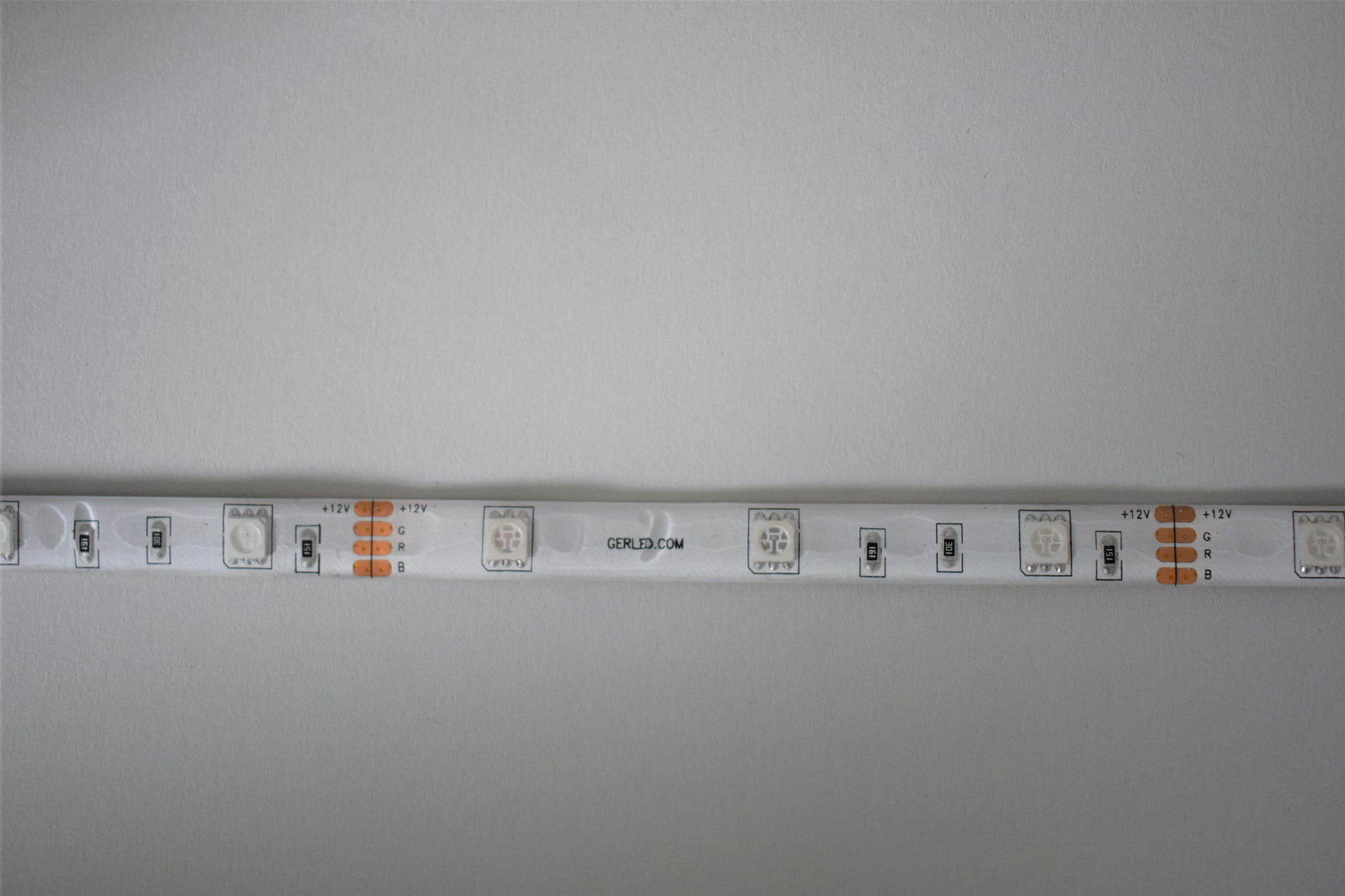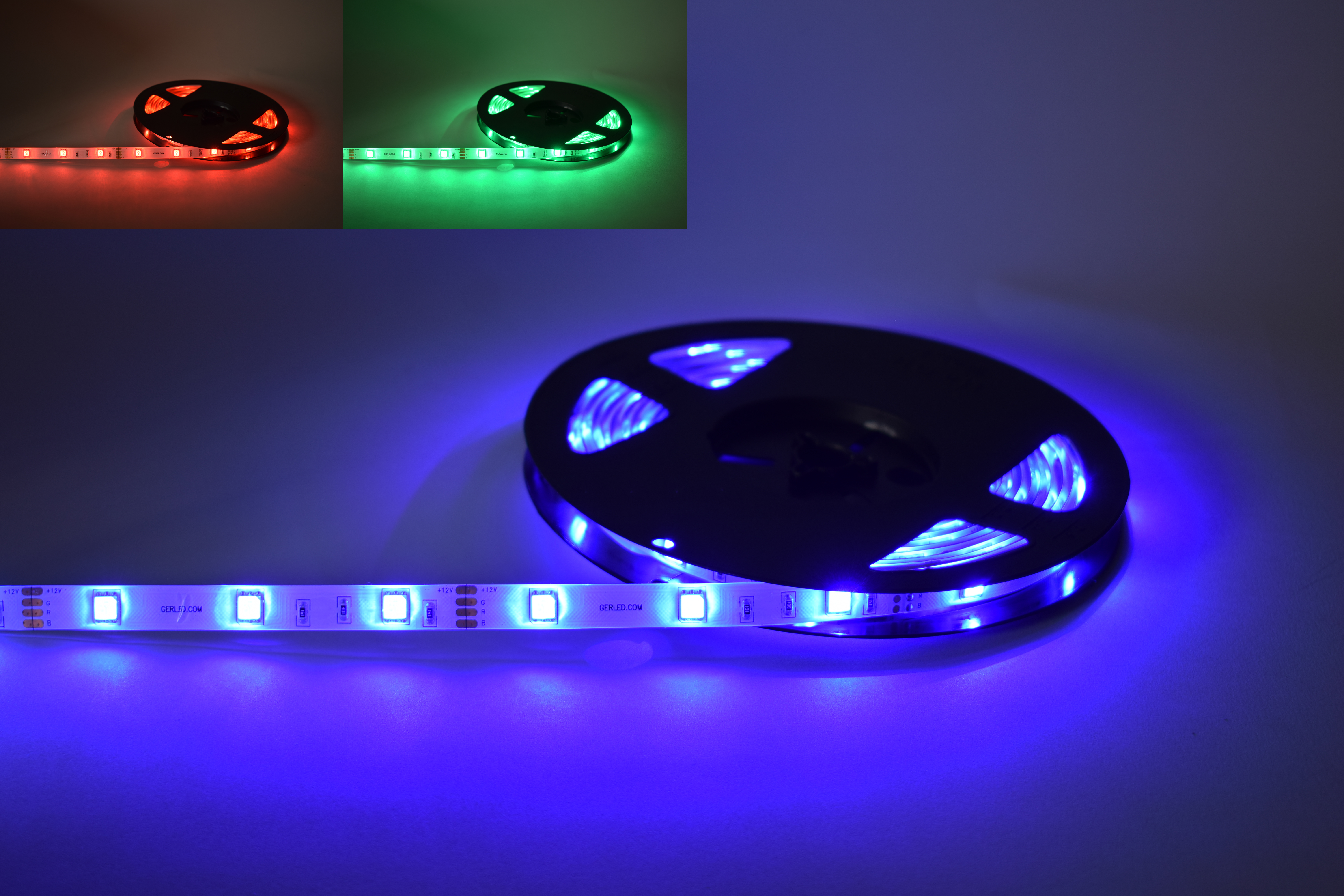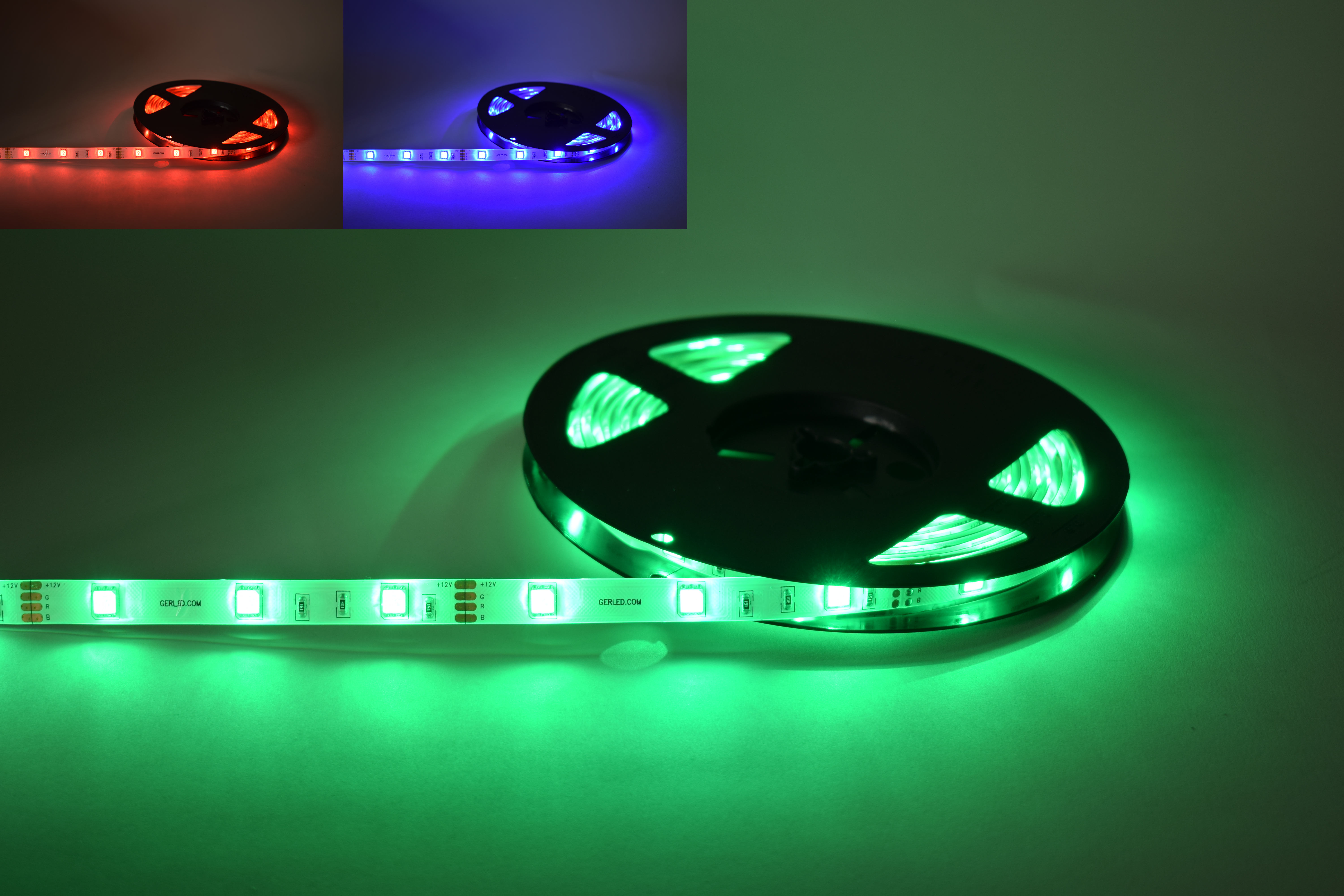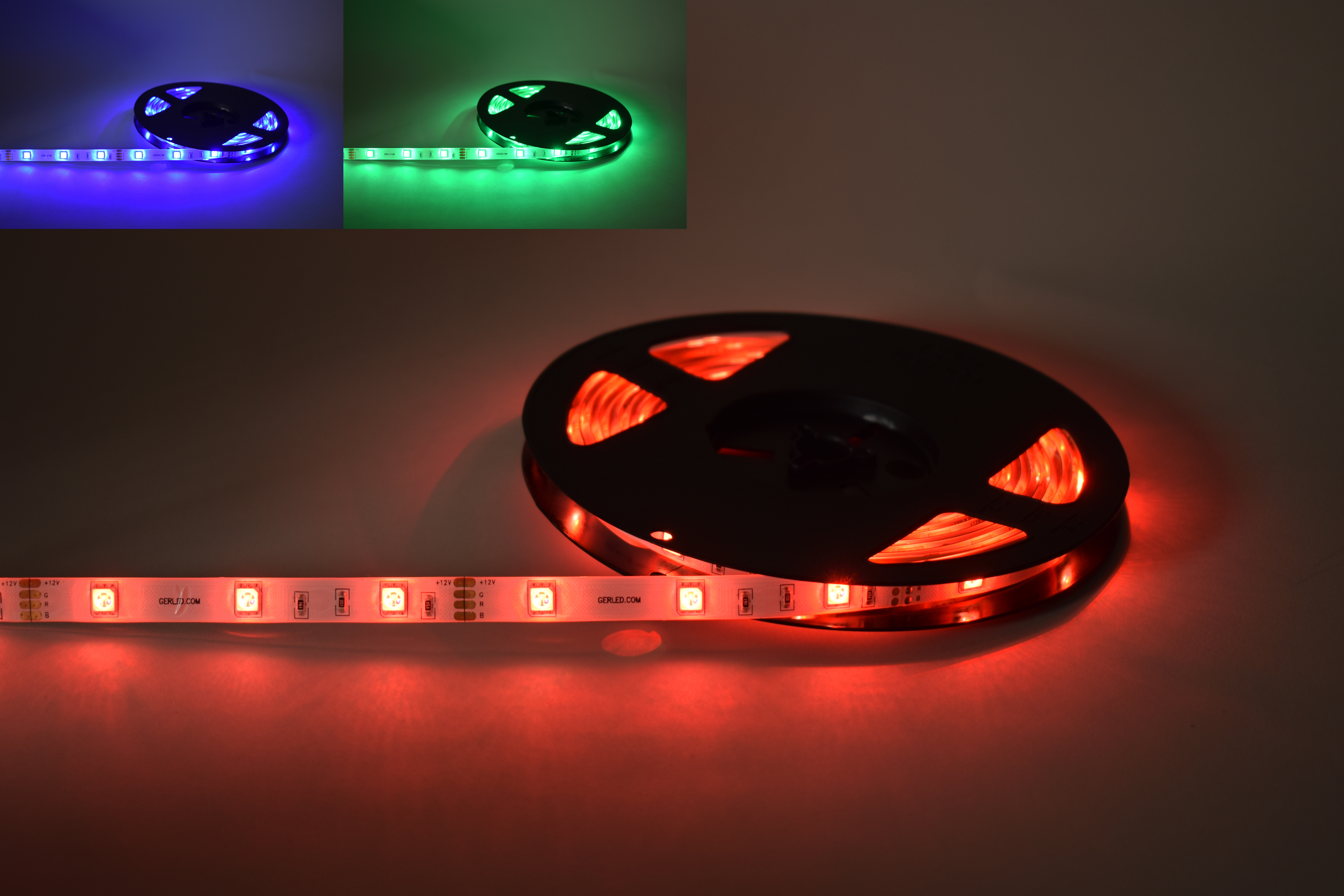 Taśma LED SMD 5050 RGB z serii GERLED® Professional IP65 posiada specjalne diody, które mogą świecić w trzech różnych kolorach - czerwonym, zielonym lub niebieskim. Kolorami oraz natężeniem światła można sterować w dowolny sposób za pomocą odpowiednio dobranego sterownika manualnego bądź z pilotem, które również znajdują się w naszej ofercie.